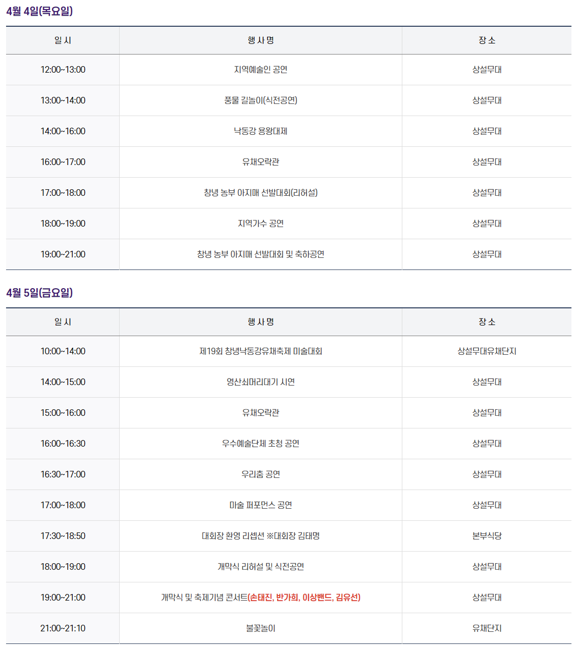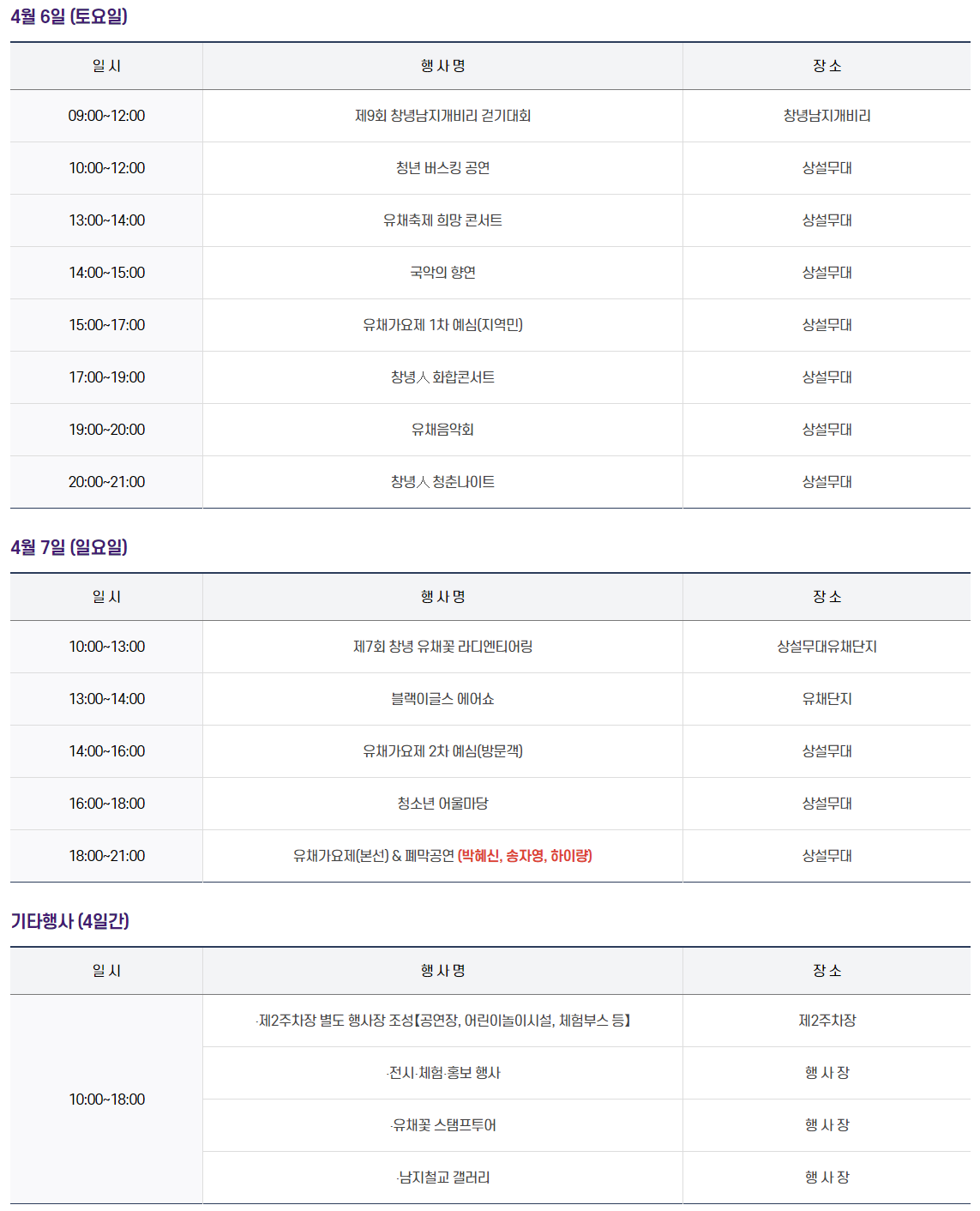 이렇듯 다채로운 프로그램과 아름다운 풍경으로 가득한 창녕 낙동강 유채 축제는 많은 이들에게 특별한 추억을 선사하고 있습니다. 여러분도 이번 축제에 참여하여 자연과 문화의 아름다움을 함께 느껴보시기 바랍니다!